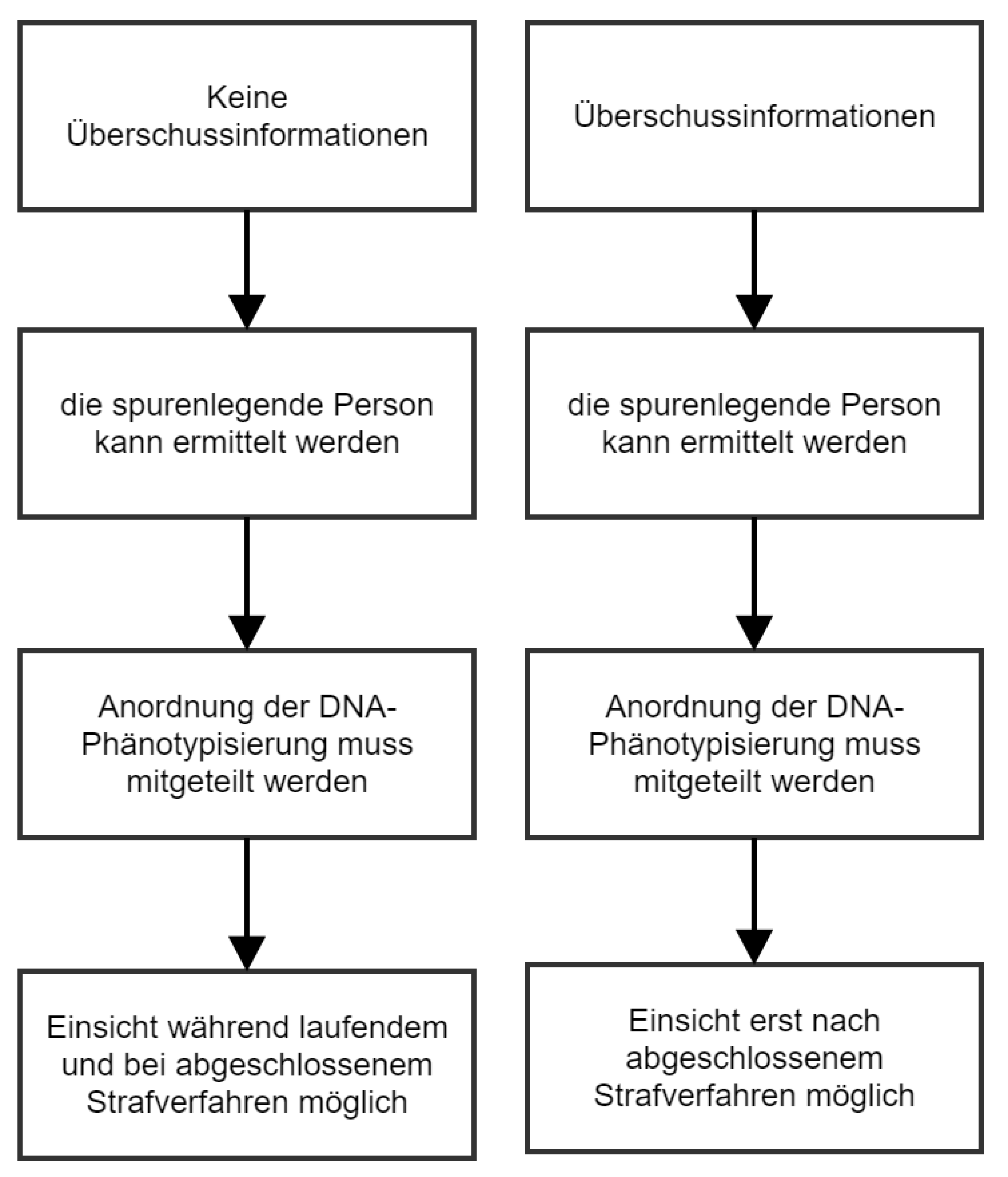 Bei noch laufendem Strafverfahren kann die betroffene Person Einsicht in Ihre Verfahrensakten verlangen. Überschussinformationen sind jedoch nie Inhalt der Verfahrensakten. Daher kann aus dem Einsichtsrecht in die Verfahrensakten kein Einsichtsrecht in die gesundheitsrelevanten Informationen aus dem Analyseverfahren der DNA-Phänotypisierung abgeleitet werden.