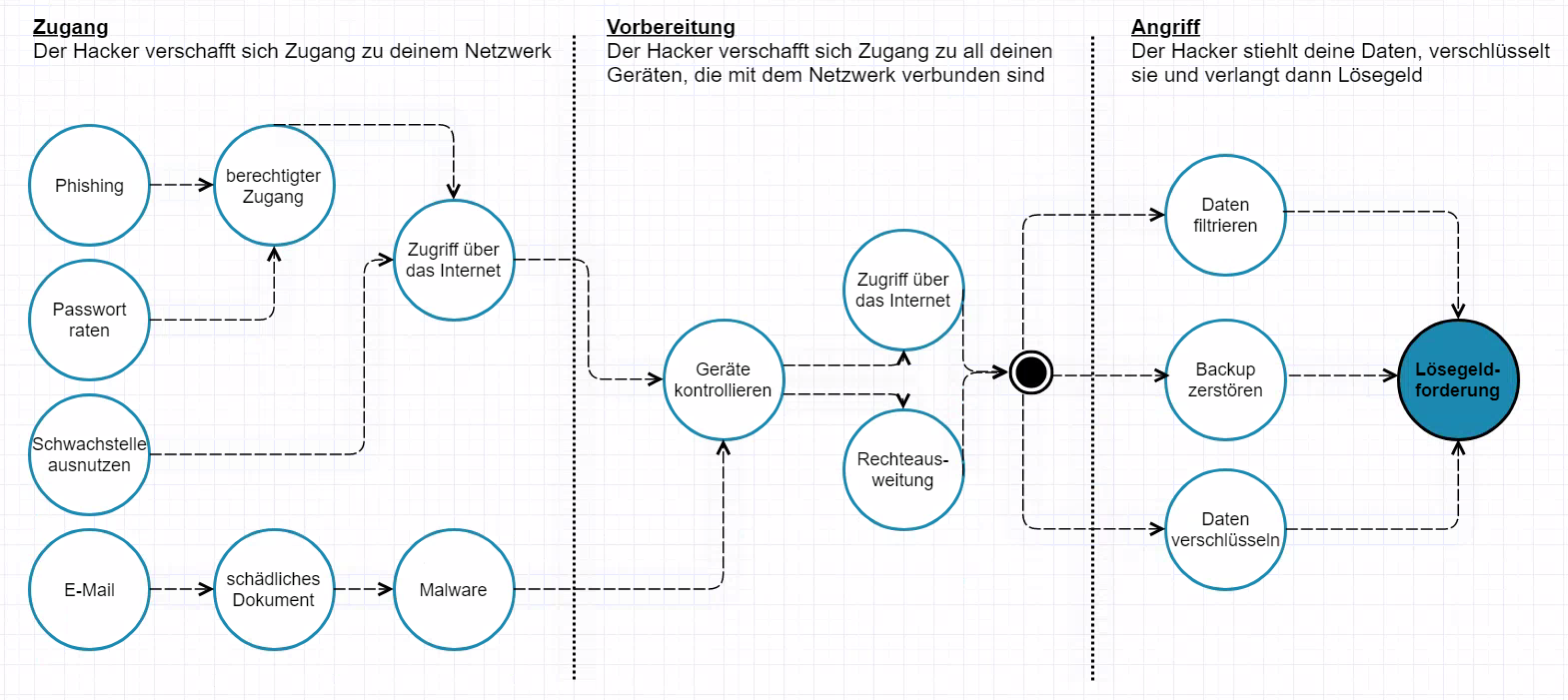 Der Cyberangriff erfolgt in drei Schritten: In einem ersten Schritt sucht sich der Hacker einen Weg, um in das Netzwerk zu gelangen (bsp. via E-Mail). In einem zweiten Schritt versucht der Hacker, sich Zugang zu allen verbundenen Geräte zu verschaffen. Und im letzten Schritt stiehlt der Hacker die Daten, verschlüsselt sie und verlangt anschiessend Lösegeld.